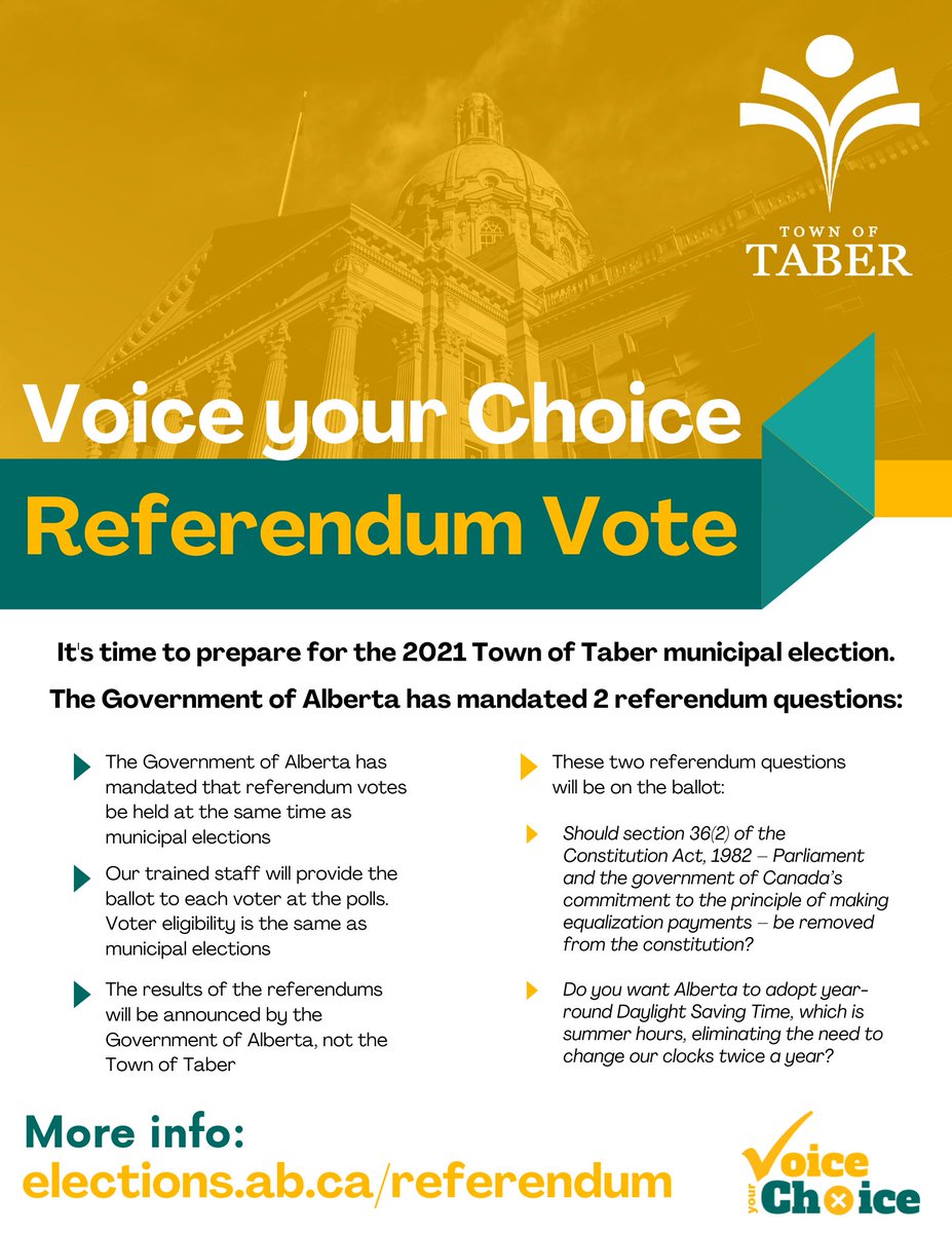 Albertans are being asked two questions in the referendum vote on October 18 2021. Electors who meet the special ballot requirements can apply for a special ballot package any time between September 7 2021 and the closing of voting stations on Election Day. The proposed change would reduce that by one hour.